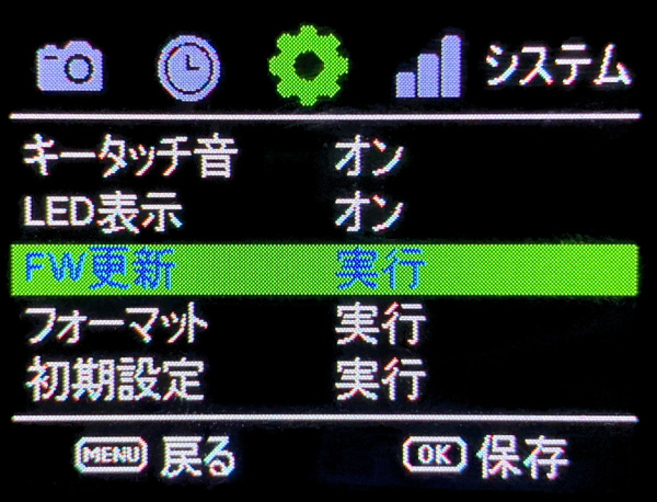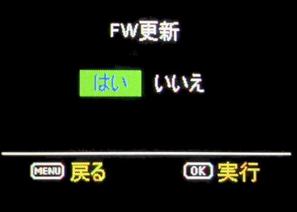 3.カメラの電源を入れてバッテリー表示が満タン(3本)であることを確認し、Menuボタンを押し、設定>FW更新を実行します。