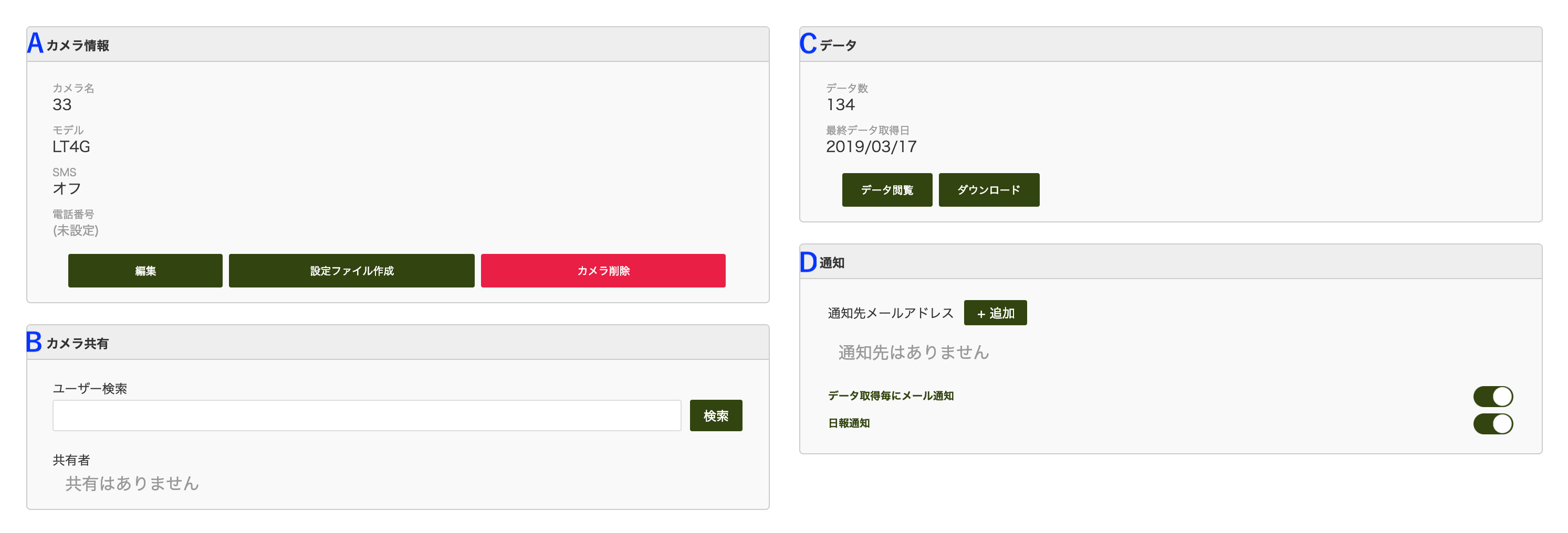 データ取得時に通知するメールアドレスはカメラ > メール通知で設定してください。