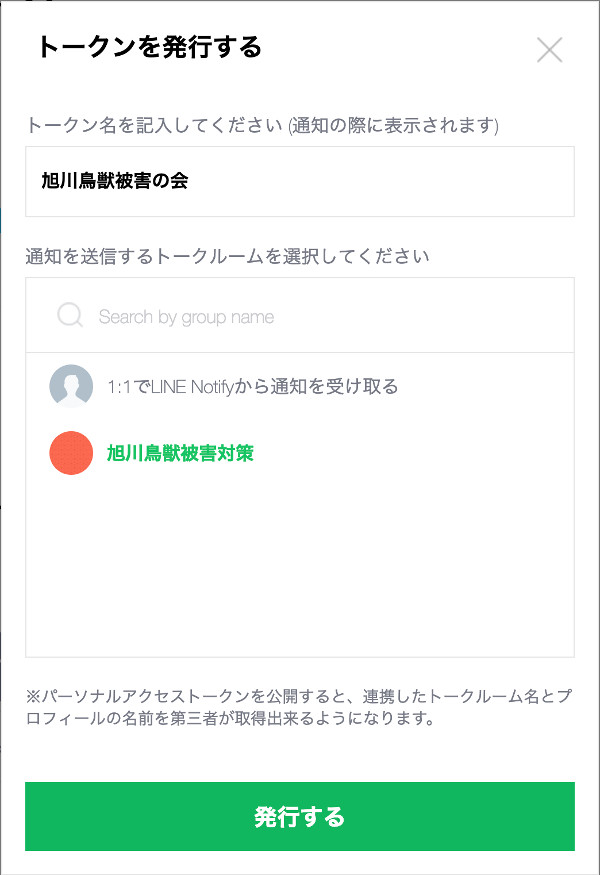 4.業務名などわかりやすいトークン名を入力し、あらかじめ作成したLINEグループを検索するか、自分のみ受け取る場合は「1:1でLINE Notifyから通知を受け取る」をクリックし、「発行する」をクリックしてください。