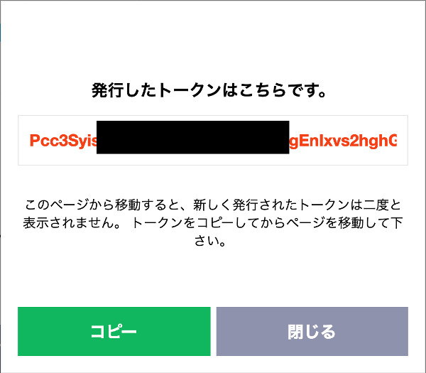 5.発行されたトークンが表示されます。「コピー」をクリックします。