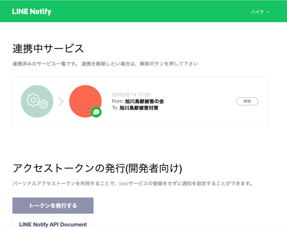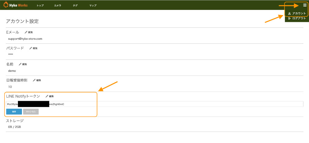 「右上」>「アカウント」>「Line Notifyトークン」の編集をクリックし、トークンを貼り付け、保存をクリックし完了です。