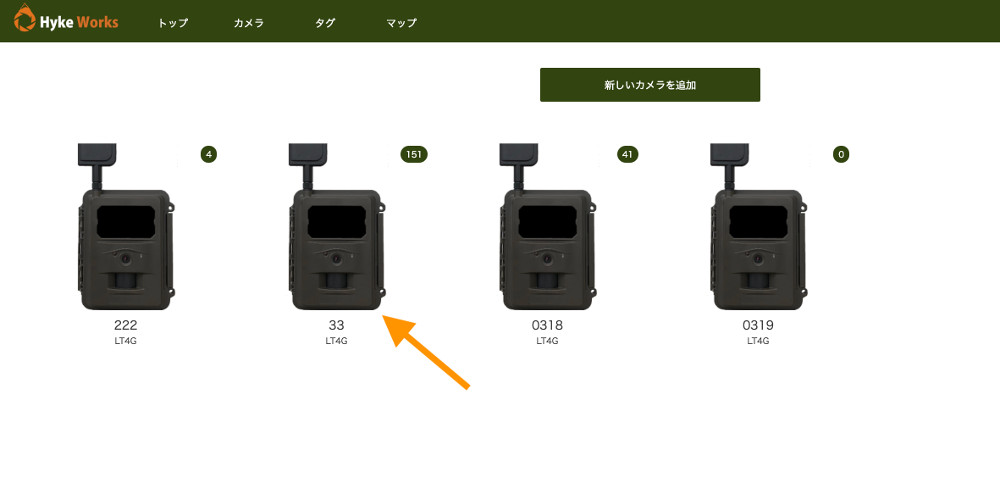 1.カメラタブより確認、編集、削除したいカメラをクリック