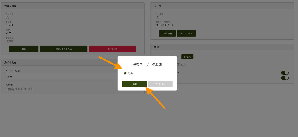 カメラ>設定したいかめ設定したいカメラ画像をクリック>メール通知 でそのカメラで取得したデータを通知するメールアドレスの追加・削除ができます。