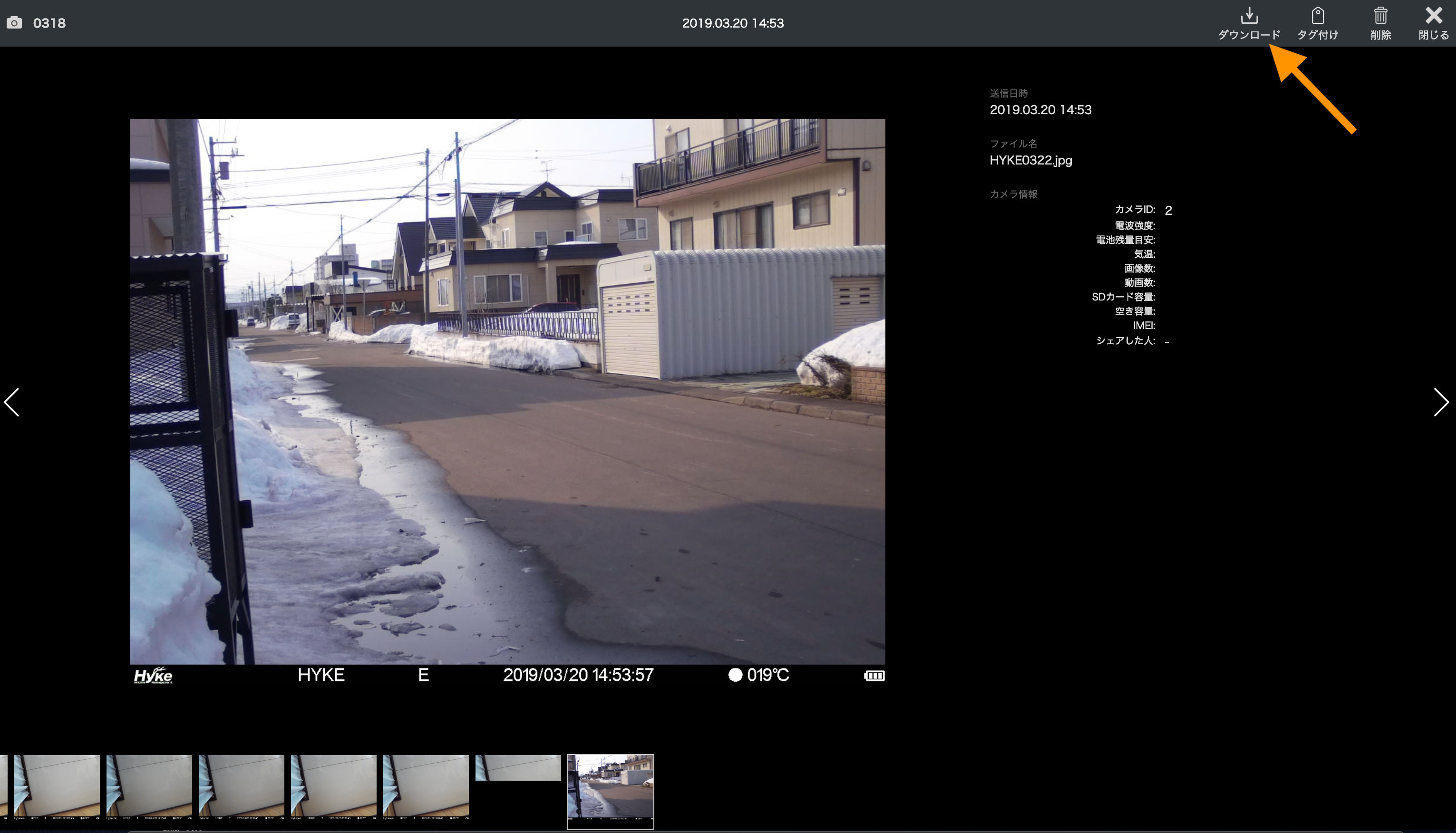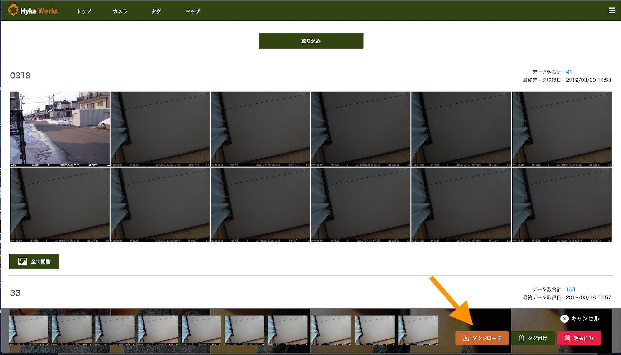 カメラ > ダウンロードしたいカメラをクリック > データ > ダウンロードで、そのカメラで撮影した全てのデータを一括でダウンロードできます。一括ダウンロードはデータ数によって大容量データとなった場合は非常に時間がかかる場合があります。またデータ通信容量を大幅に消費しますのでご注意ください。